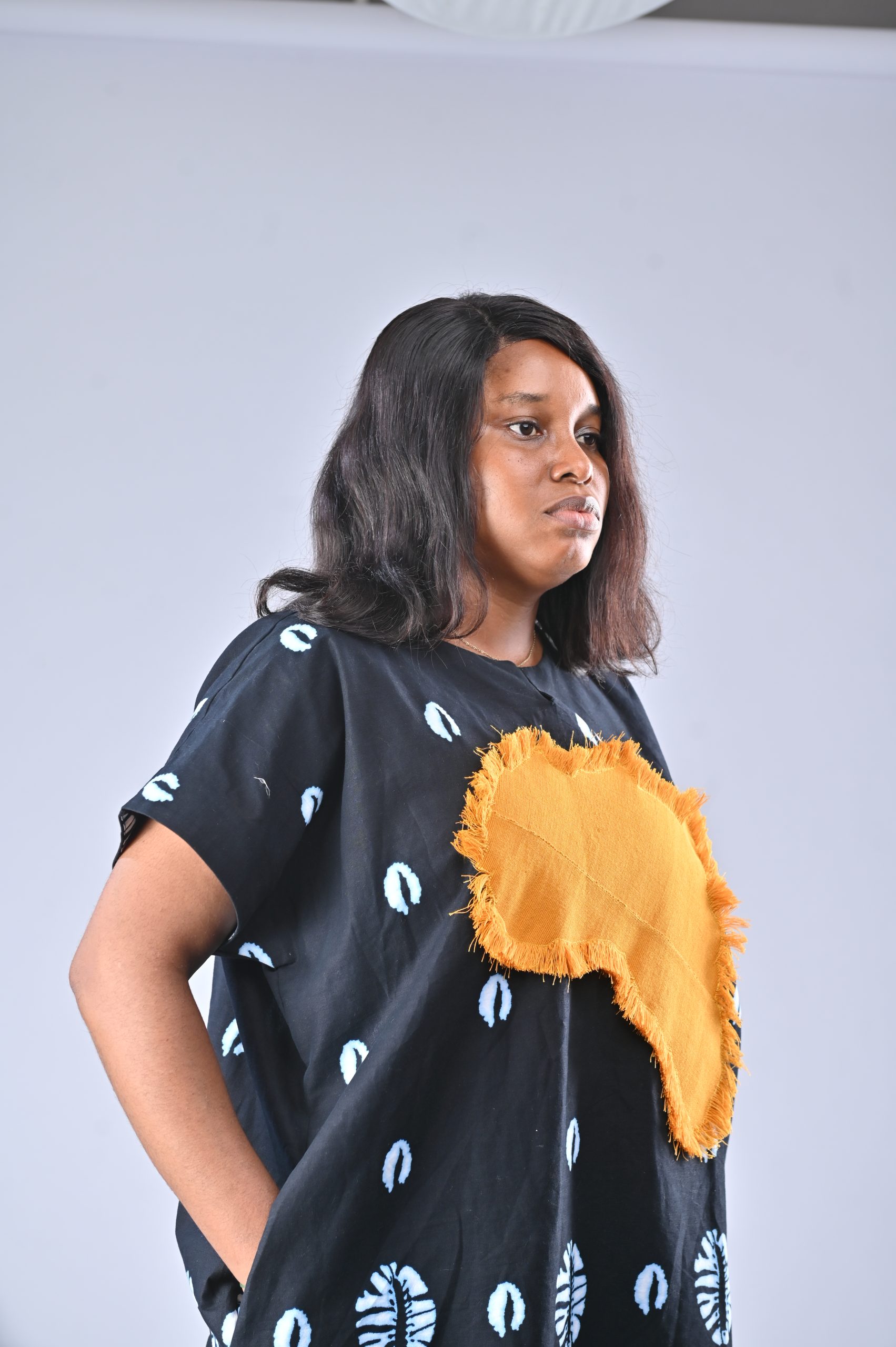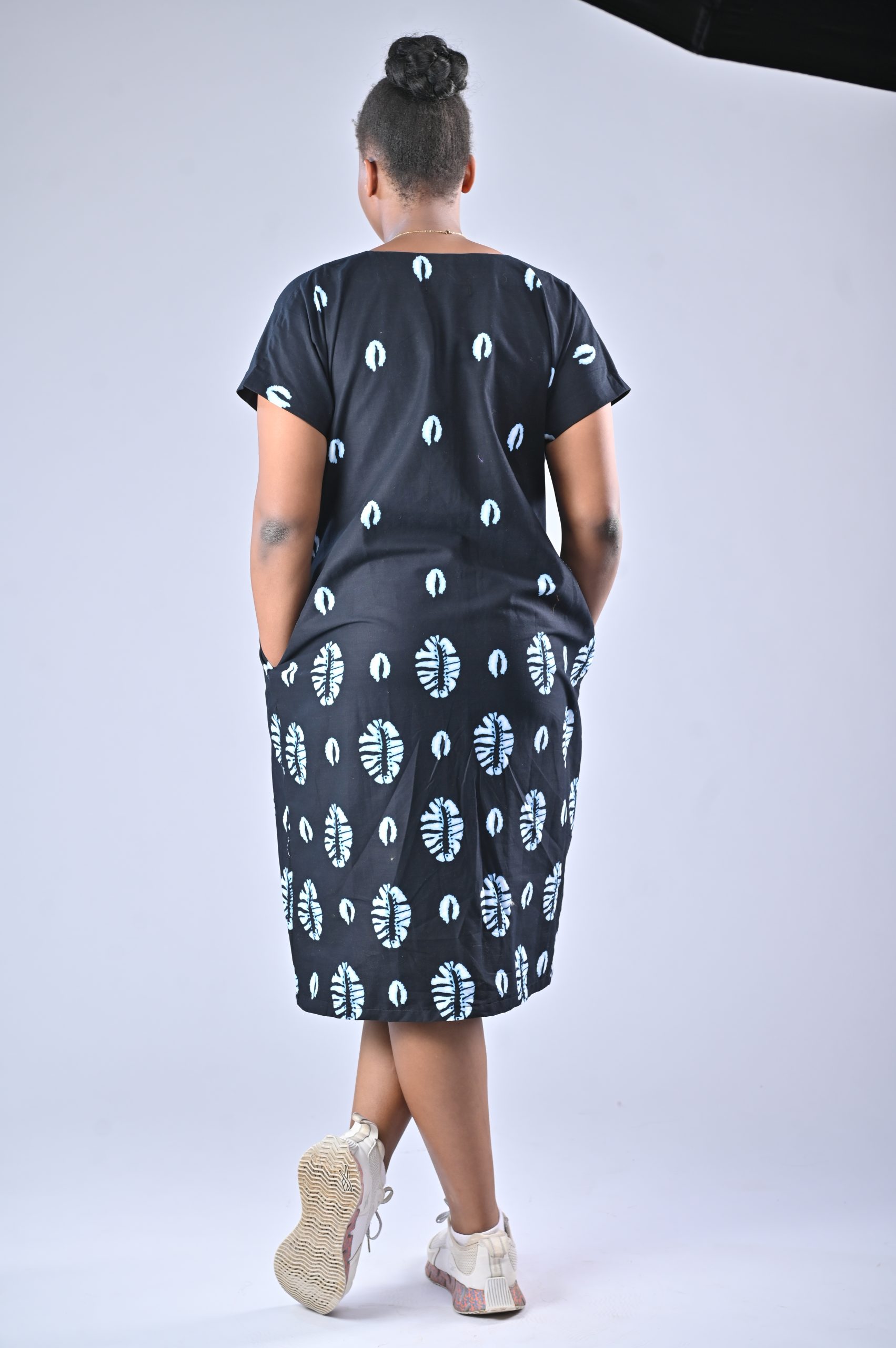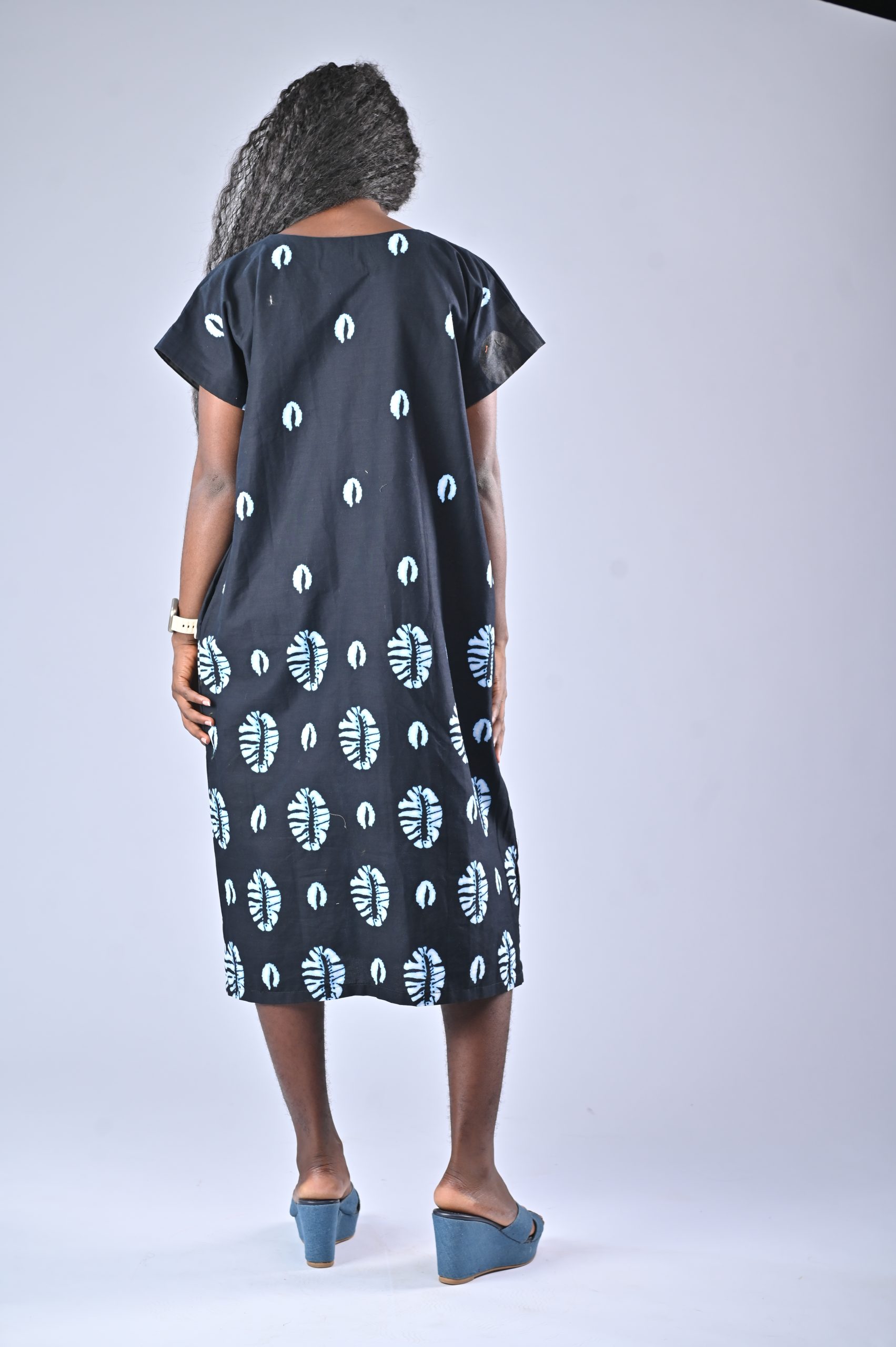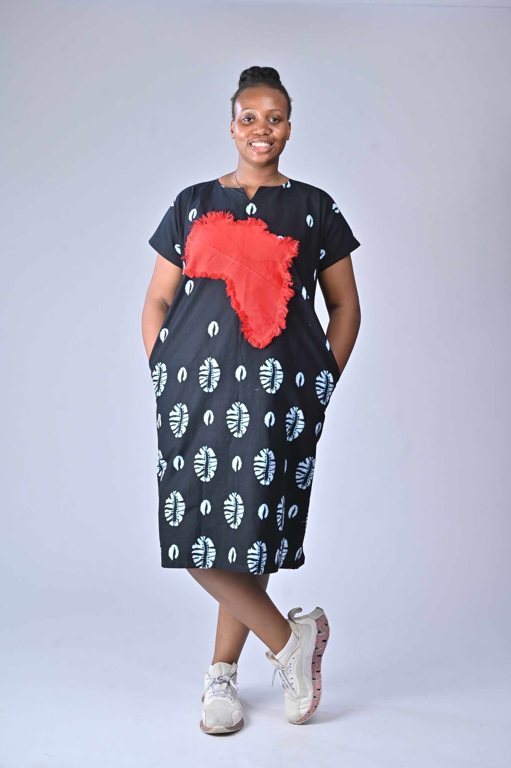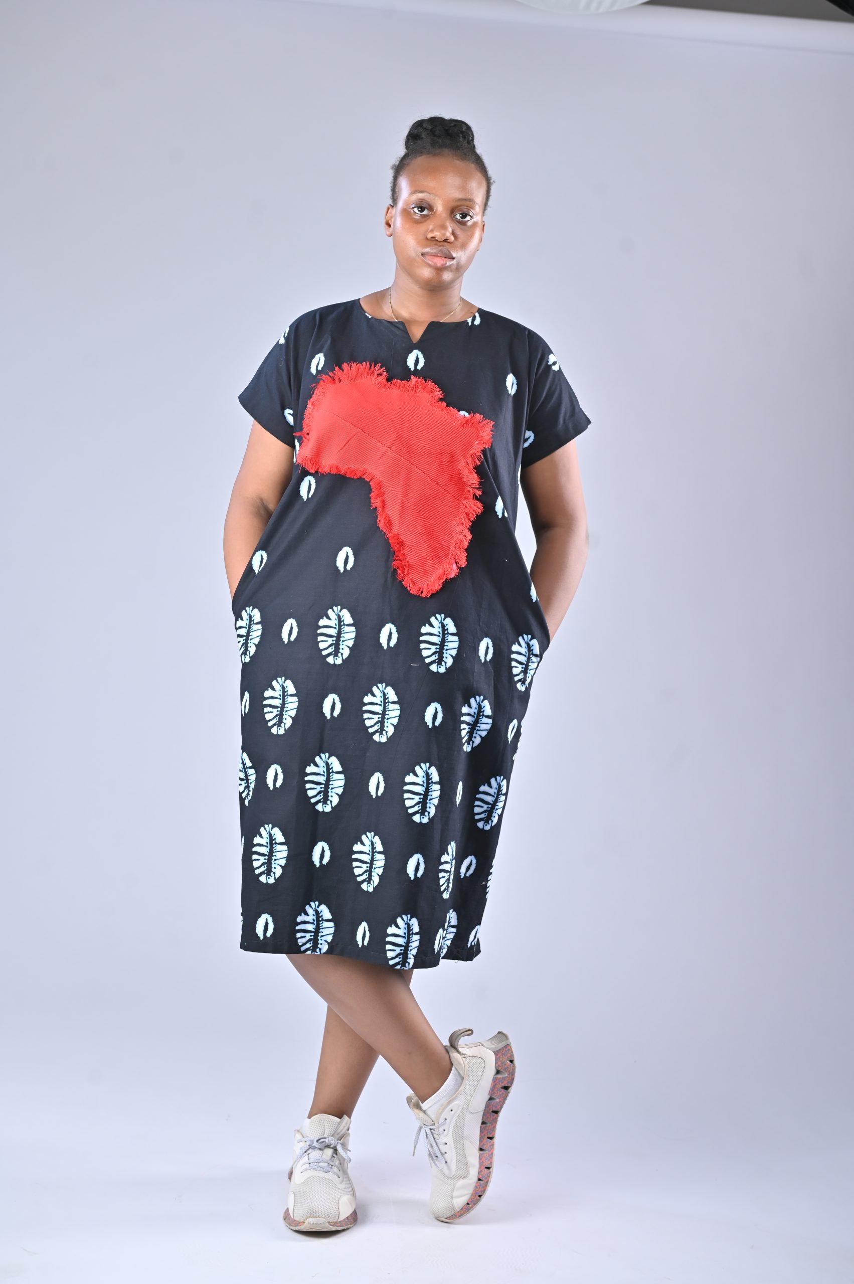 Claim your continent with the Amani African Dress—a relaxed black midi in breathable cotton adire, scattered with pale‑blue cowrie motifs and crowned by a raw‑edge appliqué of Africa in vivid colour.