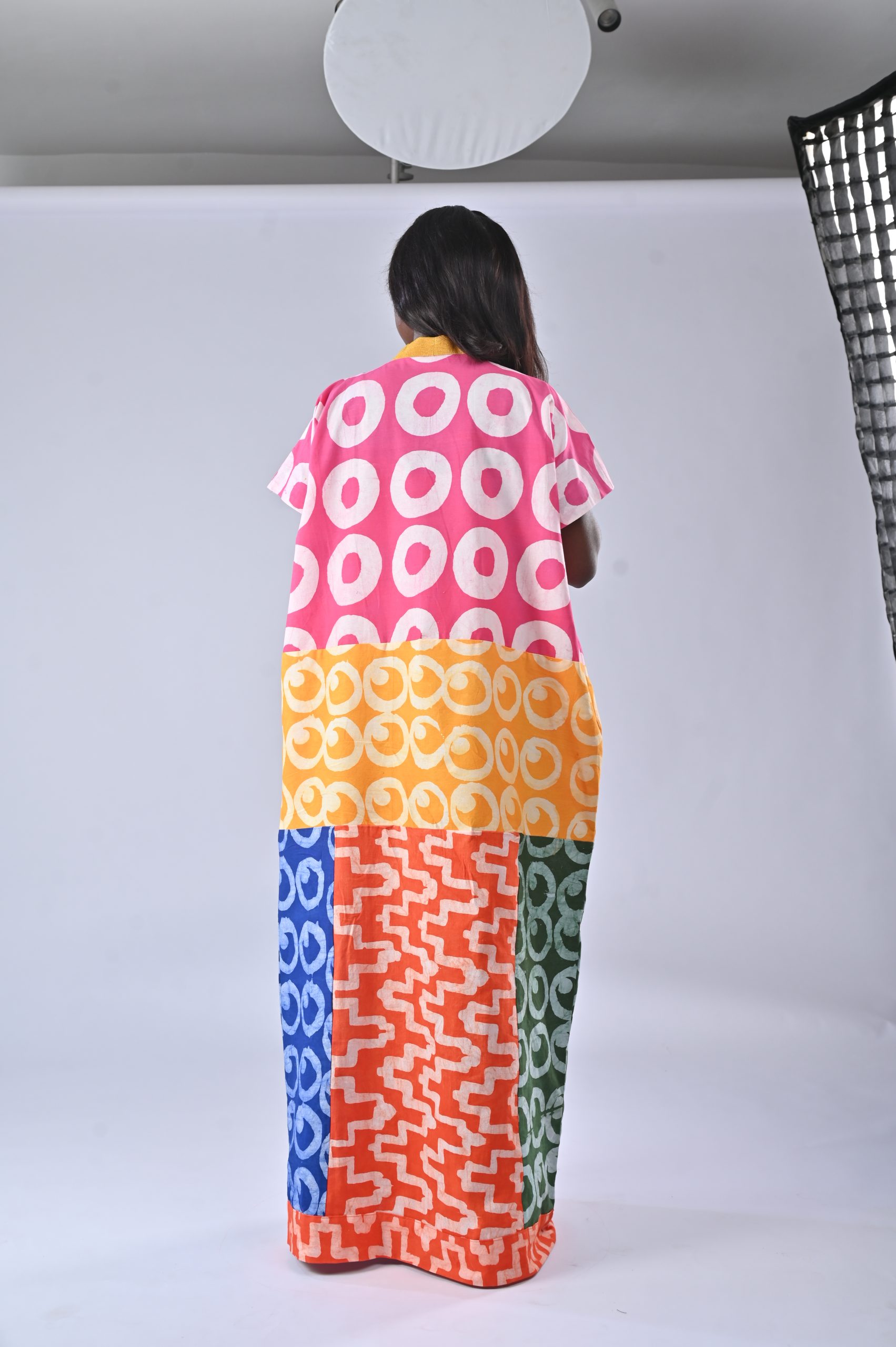 Ease into effortless style with the Chioma Patch Boubou. Handcrafted in vibrant batik-inspired cotton panels, this loose-fit maxi dress features a flattering V-neck yoke, dropped shoulders, and generous side pockets.